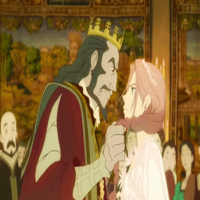 一方、本作では、序盤で王女スカーレットと、父王アムレット(cv:市村正親)との愛情が、比較的丁寧に描かれる。父王は毒殺ではなく隣国と通じた罪を着せられた末に公開処刑される。