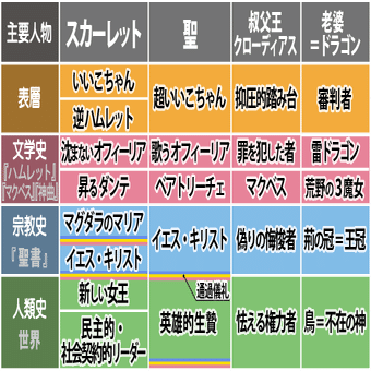 特にスカーレットの場合は、『ハムレット』世界だけでなく聖書のマグダラのマリア&キリストを重ねるために、1世紀の文化(ローマ兵)と、キリスト的存在=聖を混入させたのだろう。