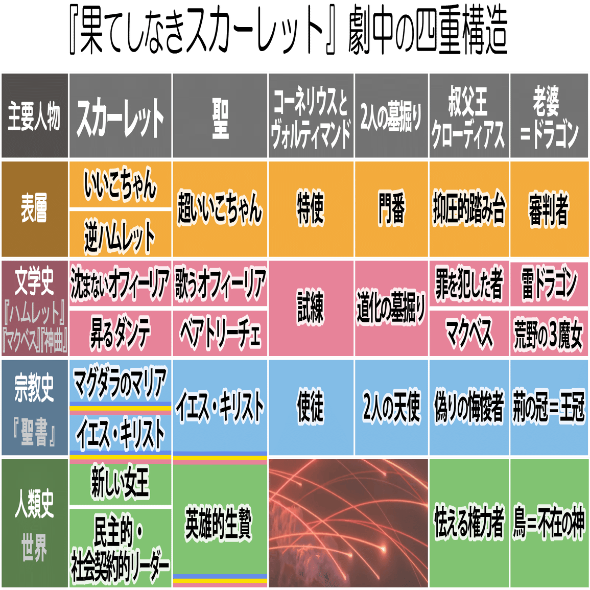 具体的には、死者の中に混じっている生者は、仮死状態のスカーレットと叔父王の2人だけ、過去の中に混じっている未来は聖1人だけである。この隠された対照を見抜くと、死者の国の意味が一気に明快になる。