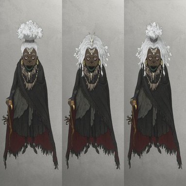 老婆のコロコロ変わる髪型や装いは、ディテールからいずれもドラゴンの化身であると匂わせつつ、老婆の中にも3種類のキャラデザ違い(ゲームのグラフィックで言う3Pカラー)があることを示している。