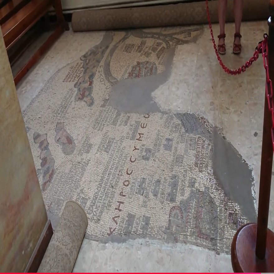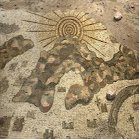 途中廃墟の教会の床に絵がされたモザイクの地図はシナイ山と太陽が一つに描かれる。これはモデルとなるマダバ地図を独自に改変したものだ。